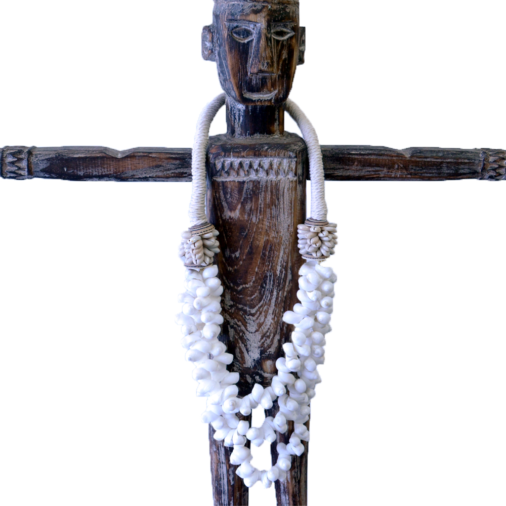 Price excludes GST Dimensions in cm: 40 Colour: White/Natural Material: Shell/Twine (displayed on Timor Polisi Man)