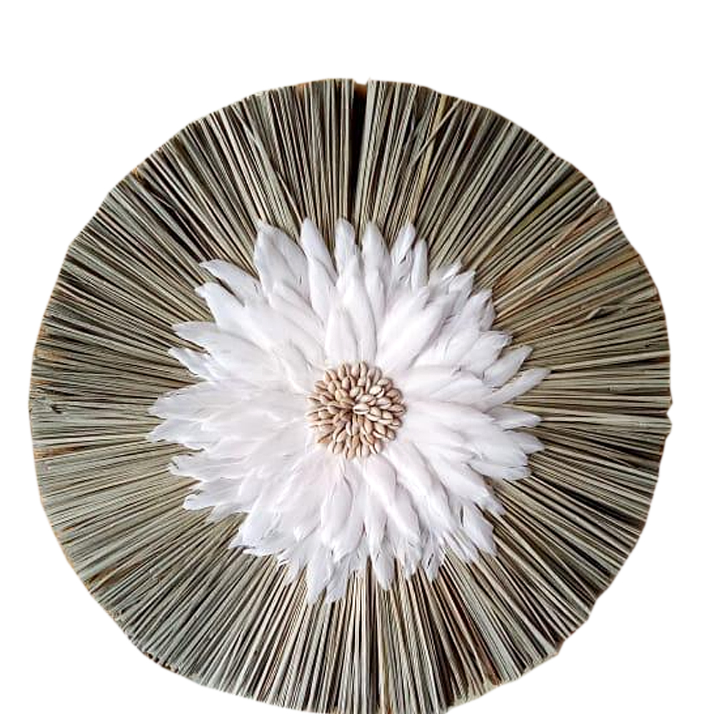Price excludes GST Dimensions in cm: 55 x 55 Colour: Natural/White Material: Feather/Shell/Grass